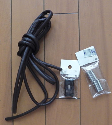 材料の左から、ひも(2m20cm。990円+税)、ひもの長さを調節するためのプラスチック製の留め具(120円+税)、ひもを輪にするための金具(2個で1セット。220円+税)。ひもは、 装着感をソフトにするため、また楽器の皮革の色とあわせるため、予算をふんぱつして、外側を皮状のビニールでおおった高級なものを選びました。