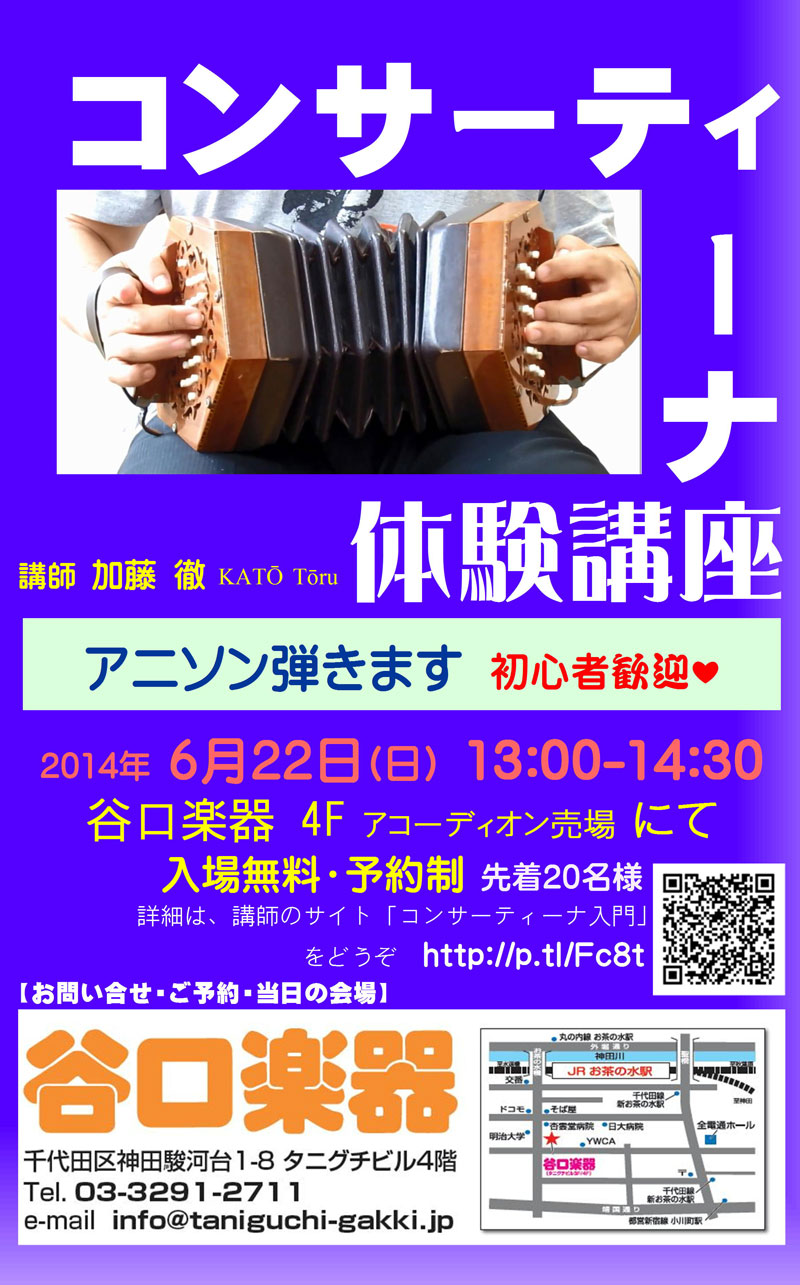 On 15th December 2013, from 13:00 to 14:30, the founder of this webpage (KATO Toru) will hold an Anglo-concertina-workshop at Taniguchi Gakki,