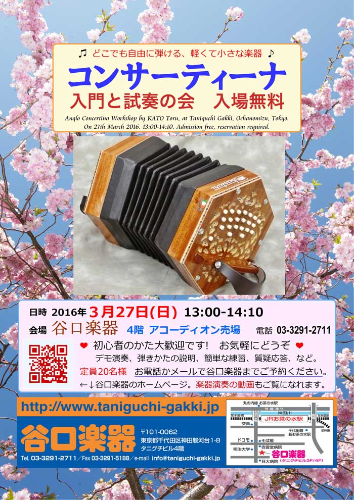たまに、御茶の水の谷口楽器で、コンサーティーナのワークショップをしています(過去の記録)。次回は2016年3月27日の予定です。入場無料、要予約。詳細は[Yahooブログのこちらの頁]を御覧ください。 ![]() |
