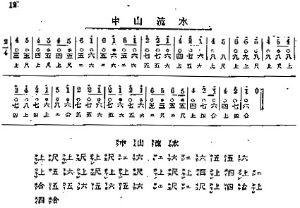「中山流水」のメロディーを[MIDIで聴く]。| ドーレー、ドレドレ、ミーソー、ミソミソ、ラーラソ、どーラソ、どーれー、みーみれ、どーれど、ラどラソ、ミーソー、ラーラソ、ラソラソ、ミレミレ、ドーラー、ソー。 |