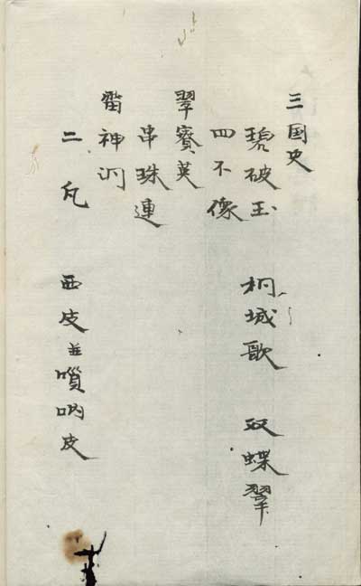 【傍点累積式音長表記、工尺譜のみ】 算命曲 九連環 茉莉花 四季曲 中山流水 厦門流水 紗窓 月花集 平和調 徳健流水 桃林宴 散花楽 補矼匠 四季 胡蝶飛 青陽寿 櫓歌 高山流水 漫板流水 光矼調(ママ) 連仝 秋籬香 柳水曲 柳雨調 広東算命曲 剪剪花 尼姑思感(ママ) 第貳排 将軍令 九子連環 蓬莱嶋 太平楽 久聞歌 万寿寺宴 四季如意 花月調 如意串 松山流水 竹林流水 梅花流水 錦[金泉]花(ママ) 第貳排 第参排 阮咸調 平板調 花園走馬 荷葉[才否](「桮」の誤字か?) 二王引 燕子門 嗩吶皮 銀紐糸 第貳排 第参排 鶴舞遊 渓庵流水 貳凡調(ママ) 想思曲(ママ) 月宮調 梁圃吟(ママ) 断板 遊童子 第貳排 第三排 西皮調 魚心調 今様 (見開き2頁ぶん) 【歌詞右傍工尺譜、音調表記無し、唐音ルビあり】 四季曲 抹梨花(ママ) 紗窓 九連環(歌詞第一番) 秋江別 第貳排 第参排 清平調 九連環(歌詞第二番) 久聞歌 月花集 平和調 銀紐糸 第貳排 第参排 茉莉花 【傍点累積式音長表記、工尺譜のみ】 参国主之内 碧破玉(ママ) 相城歌(ママ) 双蝶翠 月宮殿・再附後弾【傍点累積式音長表記工尺譜、および「歌詞右傍工尺譜、音調表記無し、唐音ルビあり」の混合】 |