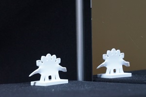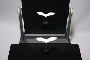 鏡に正面を向いたものは、鏡の中では振り向いて逆を向くはずですが、この立体は振り向かないでそのまま同じ姿勢で鏡の中へ平行移動してしまいます。この錯視は、立体自体を正面から少し向きをずらしたり、見る方向を鏡の正面からずらしたりしても安定に置き続けるという特徴を持っています。