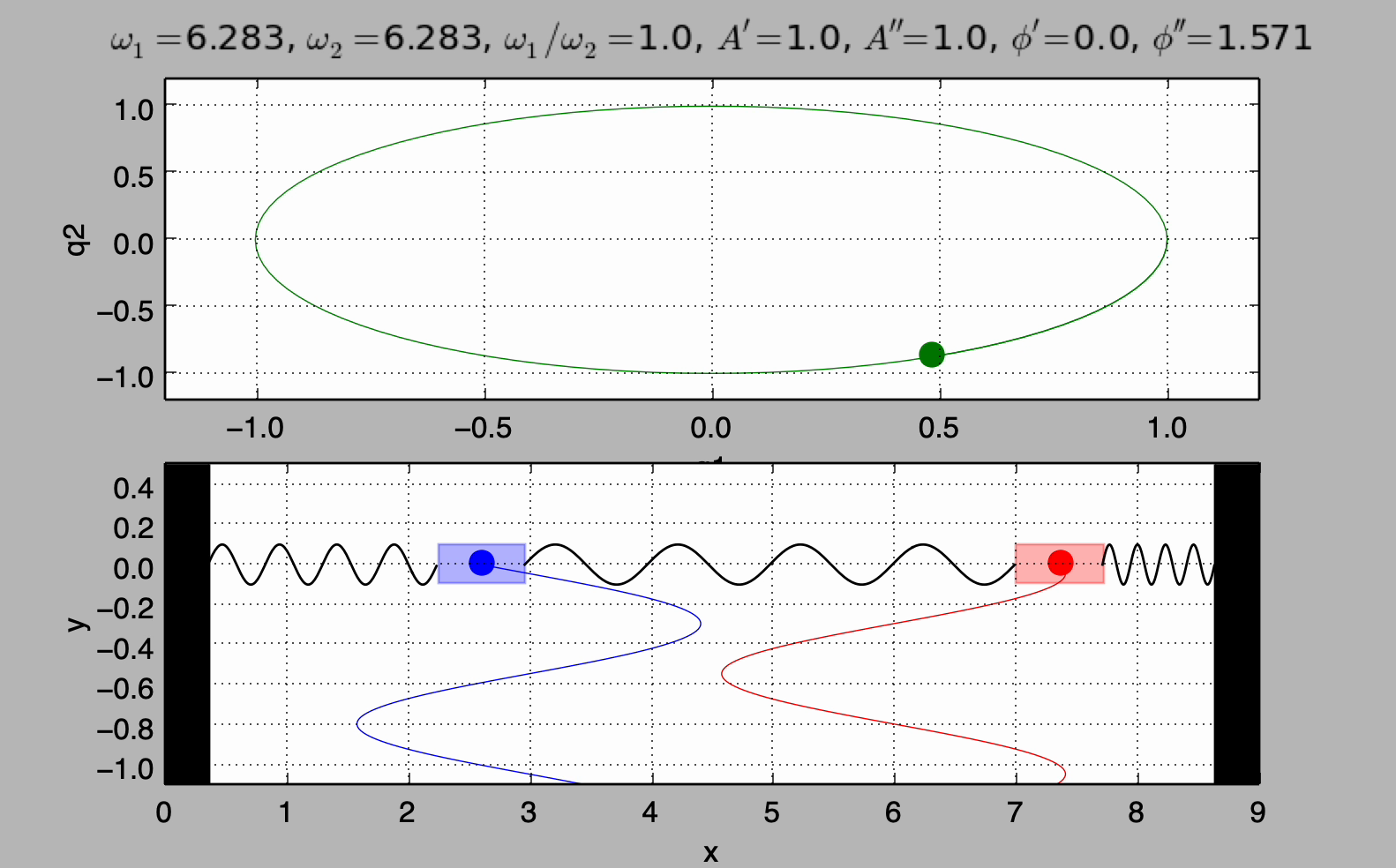 であり, , の値が近い場合, 下図のように, 各おもりは大きい振動数 で細かく振動しつつ, 全体では小さな振動数 で緩やかに振動することを確認した.
