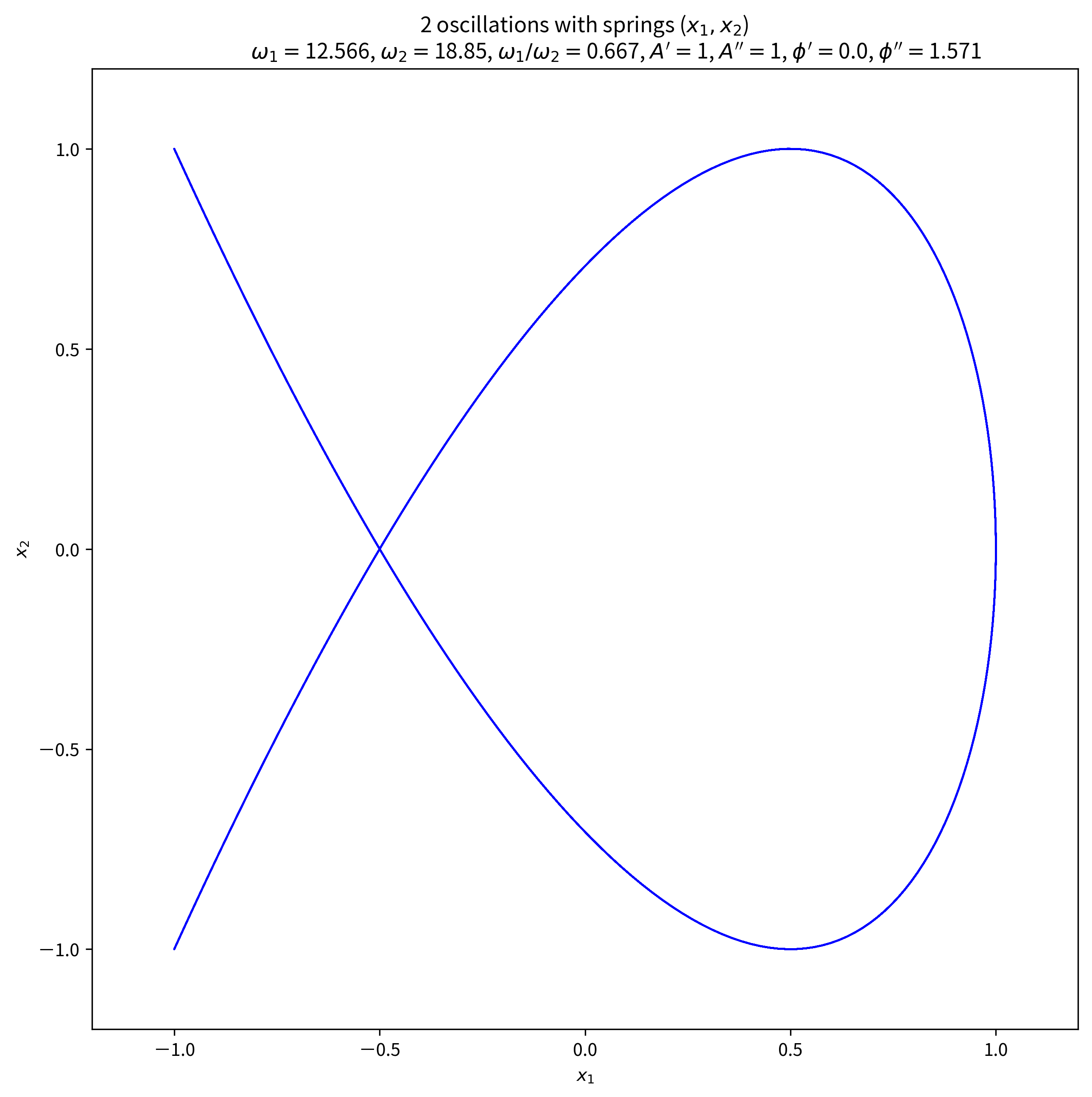 より, それぞれ独立に単振動を行うため, 全体としての点 は, 軸に平行な矩形の中で運動する. ここで描かれるような, 直交する単振動を合成して得られる図形はリサジュー図形と呼ばれる.