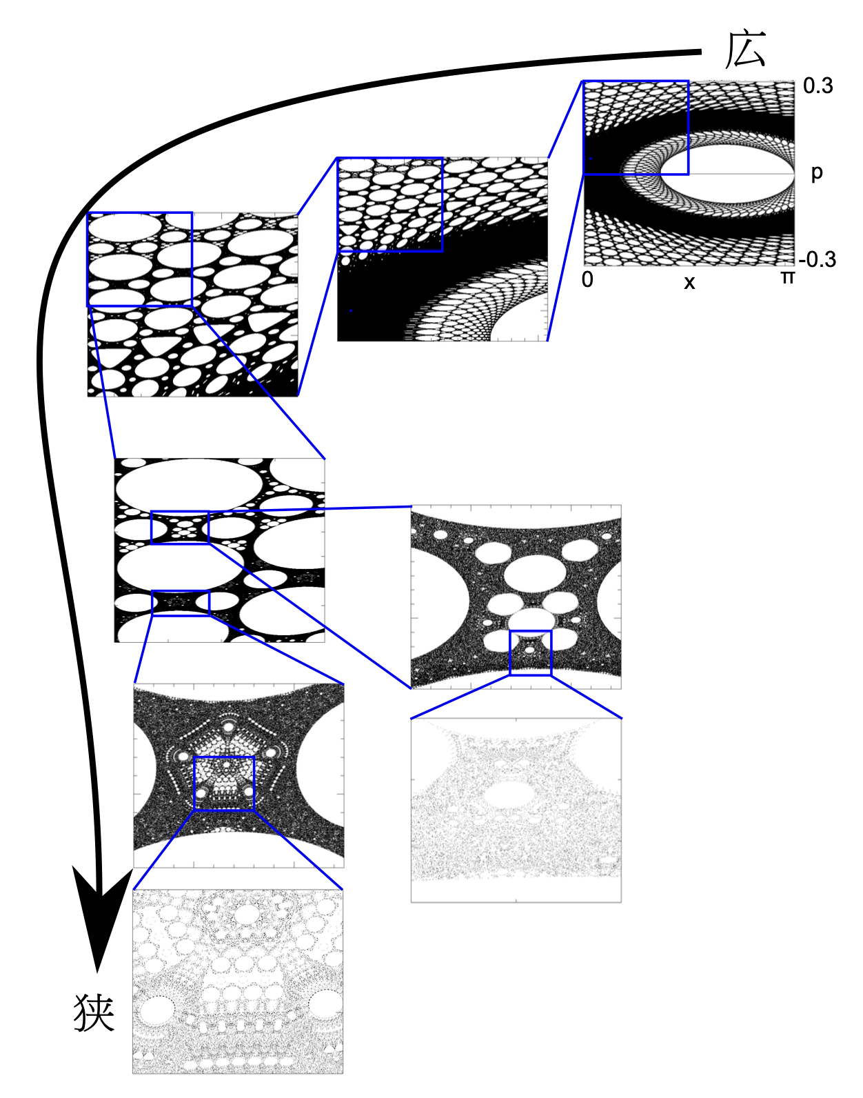 このとき, 位置を横軸, 運動量を縦軸にして, 撃力が当たった瞬間をplotしていくと, 下図のような蜘蛛の巣状を形成する.