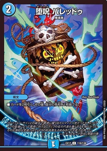 主要パーツの盾落ちケア兼ループフィニッシャー兼「堕呪 バレッドゥ」の5枚目以降です。採用しておくと「ガル・ラガンザーク」へのアクセス率が多少上がりますが、環境最大母数が見込まれる赤青マジックに対する回答を殿堂カードのみに頼るのは不安が残ると感じたため、今回は「ボン・キゴマイム/♪やせ蛙 ラッキーナンバー ここにあり」に枠を譲る形で不採用にしました。