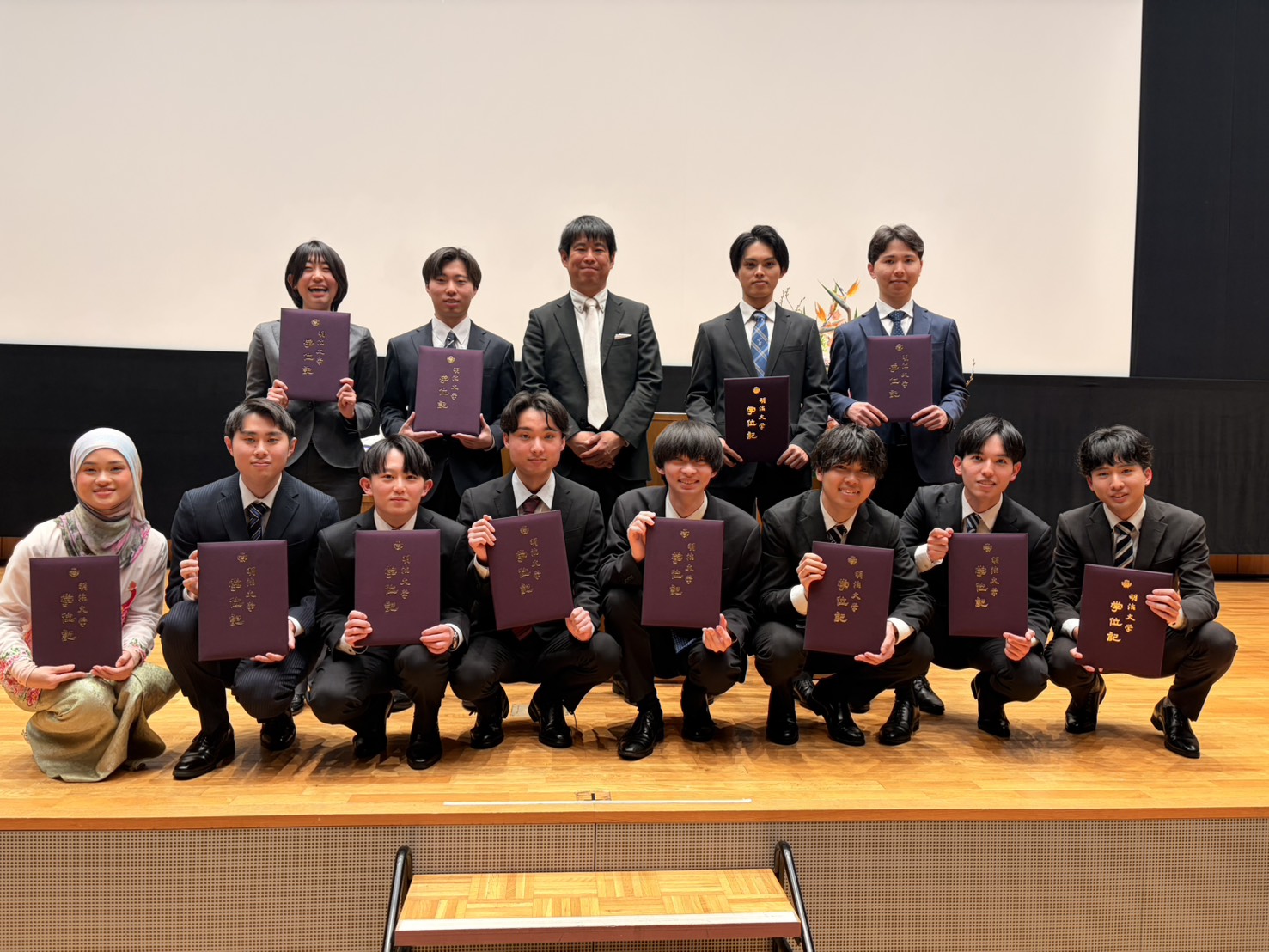 3月26日に2025年度学位記授与式が行われました. M2の青柳,一谷,関和,本多,B4の井亀,内海,江名,荻原,高橋,船越,柳,Izzatiが授与式に参加しました. M2の皆さんは2年間,B4の皆さんは4年間お疲れ様でした. 卒業・修了おめでとうございます!皆さんの今後のご活躍をお祈りしています!