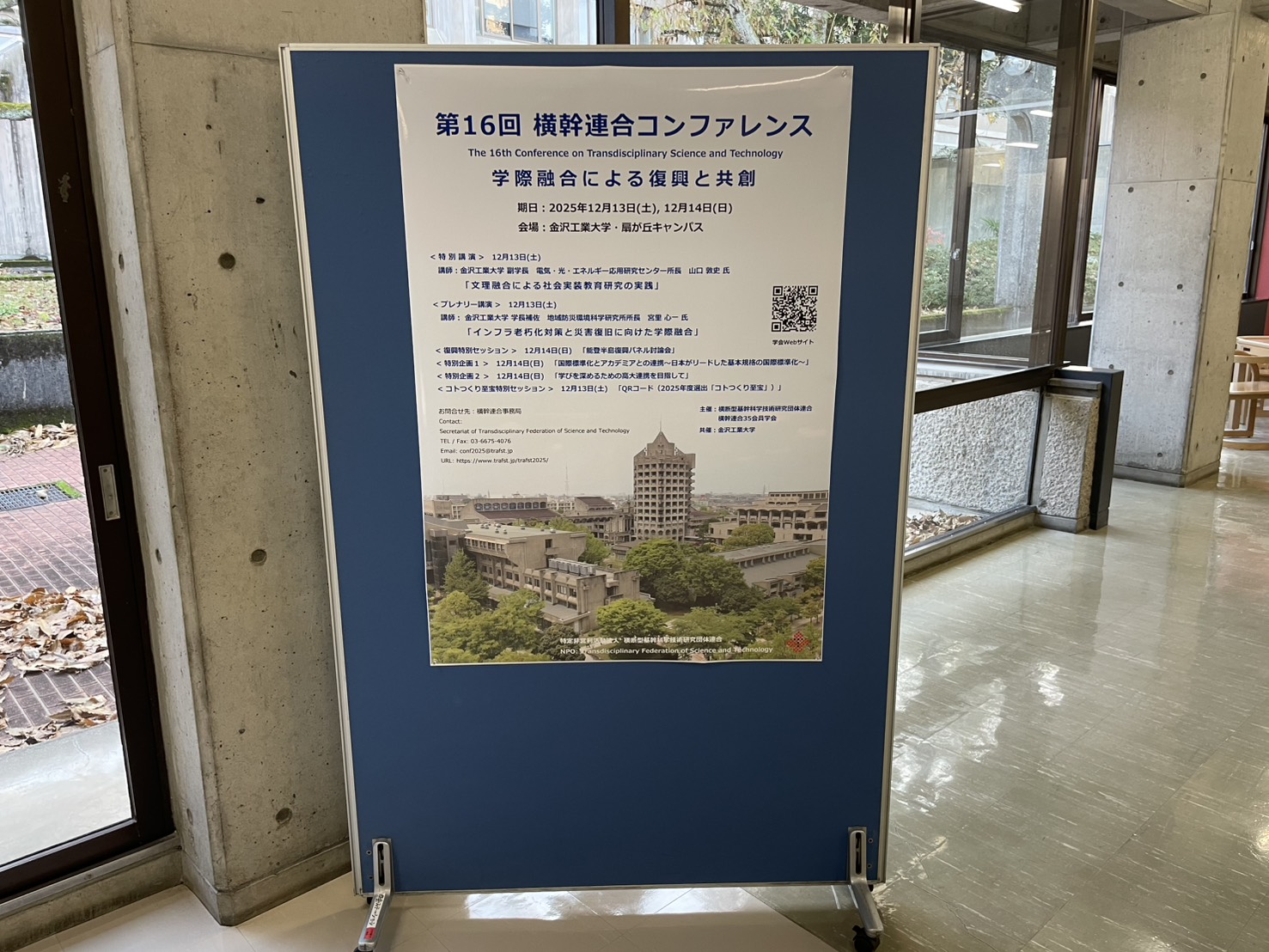 12月13日に金沢工業大学 扇が丘キャンパスで開催された第16回横幹連合コンファレンスで,M1狩野が「モバイルロボットのガウス過程を⽤いた作業環境学習に基づく衝突回避制御」のテーマの下,研究発表を行いました.分野を超えたポスター発表であったことから,様々な分野の方から貴重なご意見を頂くことができ,とても為になりました.