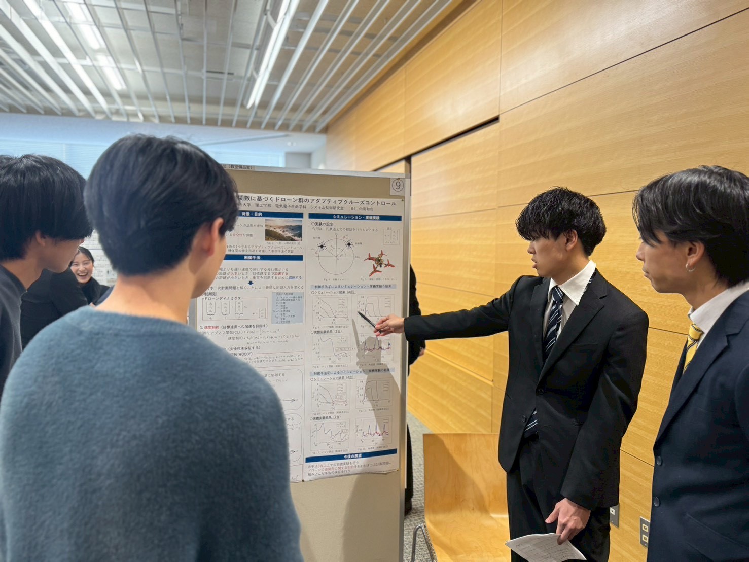 B4内海が「制御バリア関数に基づくドローン群のアダプティブクルーズコントロール」をテーマとしてポスター発表している様子です.