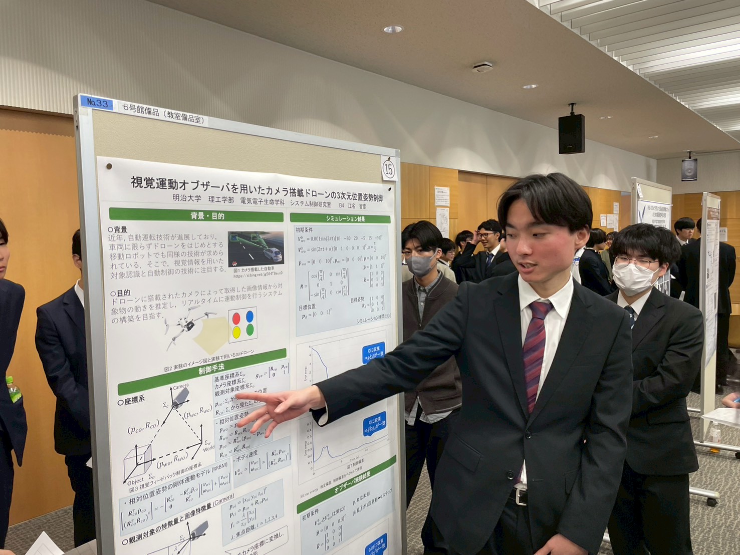 B4江名が「視覚運動オブザーバを用いたカメラ搭載ドローンの3次元位置姿勢制御」をテーマとしてポスター発表している様子です.