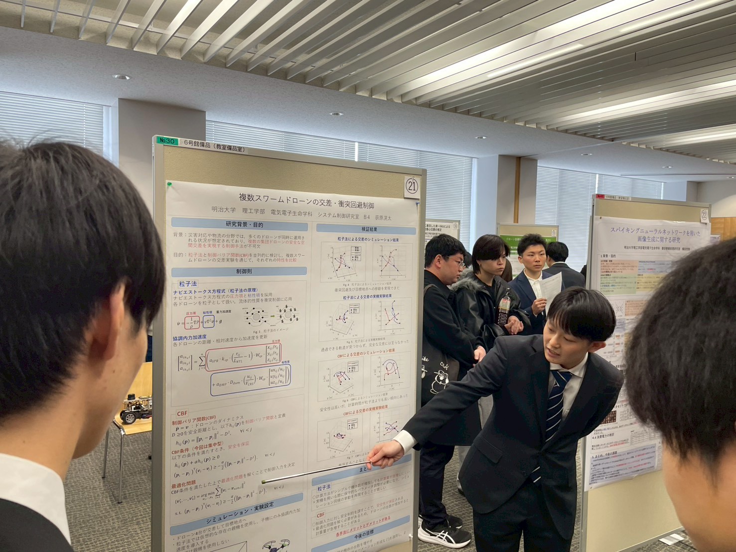 B4荻原が「複数スワームドローンの交差・衝突回避制御」をテーマとしてポスター発表している様子です.