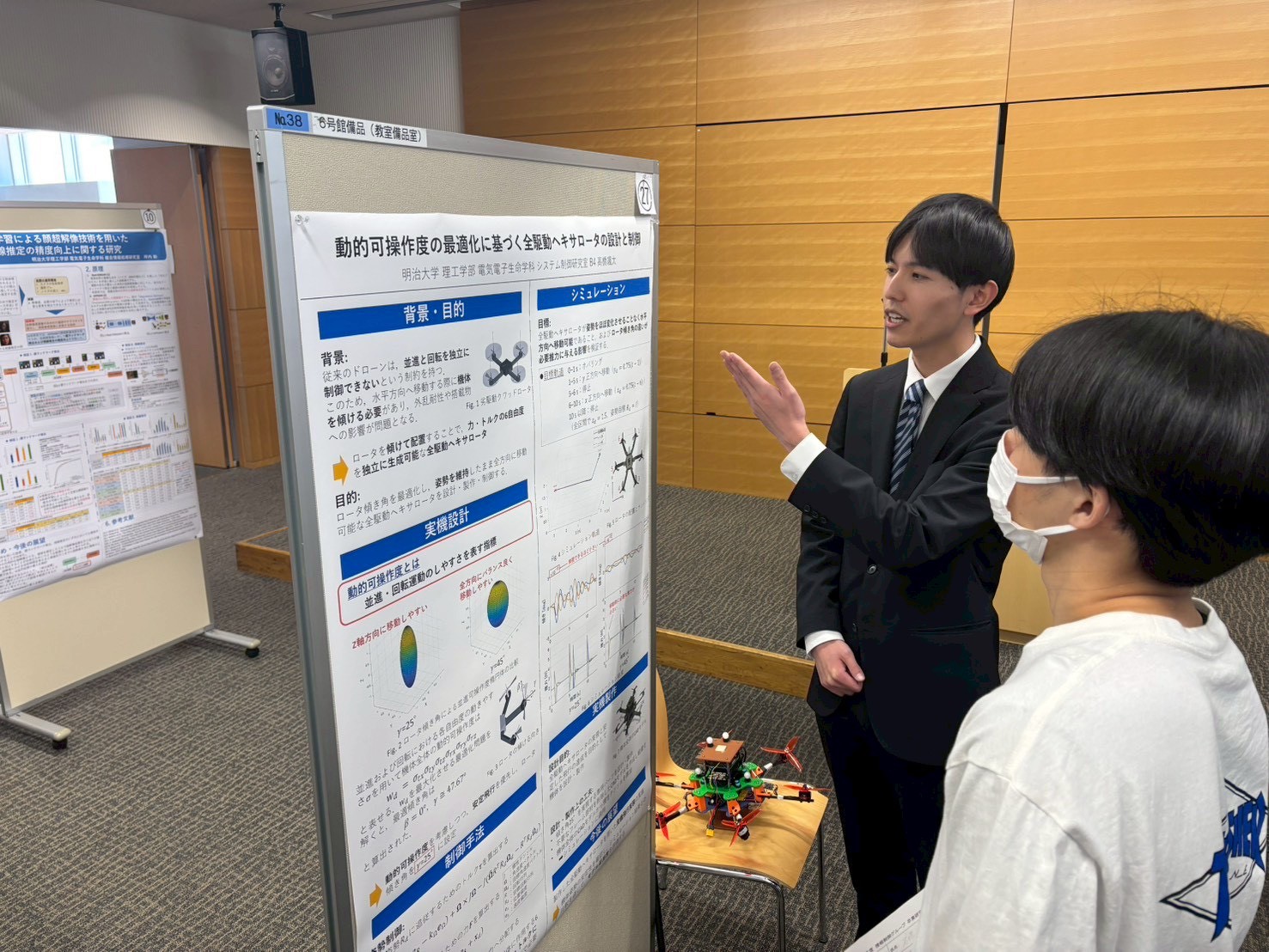 B4高橋が「動的可操作度の最適化に基づく全駆動ヘキサロータの設計と制御」をテーマとしてポスター発表している様子です.