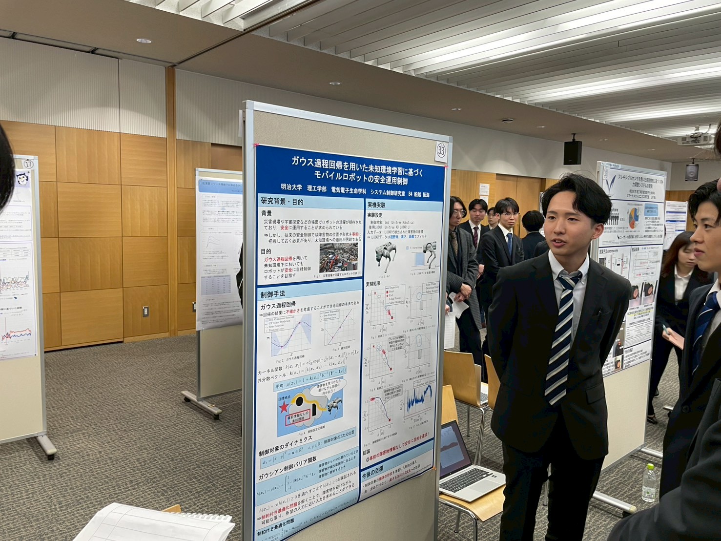 B4船越が「ガウス過程回帰を用いた未知環境学習に基づくモバイルロボットの安全運用制御」をテーマとしてポスター発表している様子です.