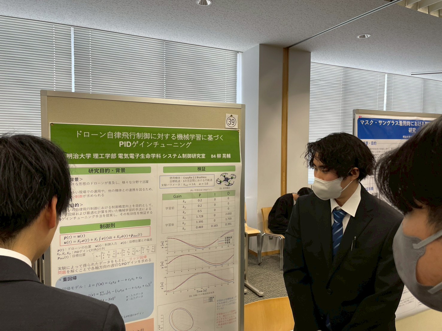 B4柳が「ドローン自律飛行制御に対する機械学習に基づくPIDゲインチューニング」をテーマとしてポスター発表している様子です.