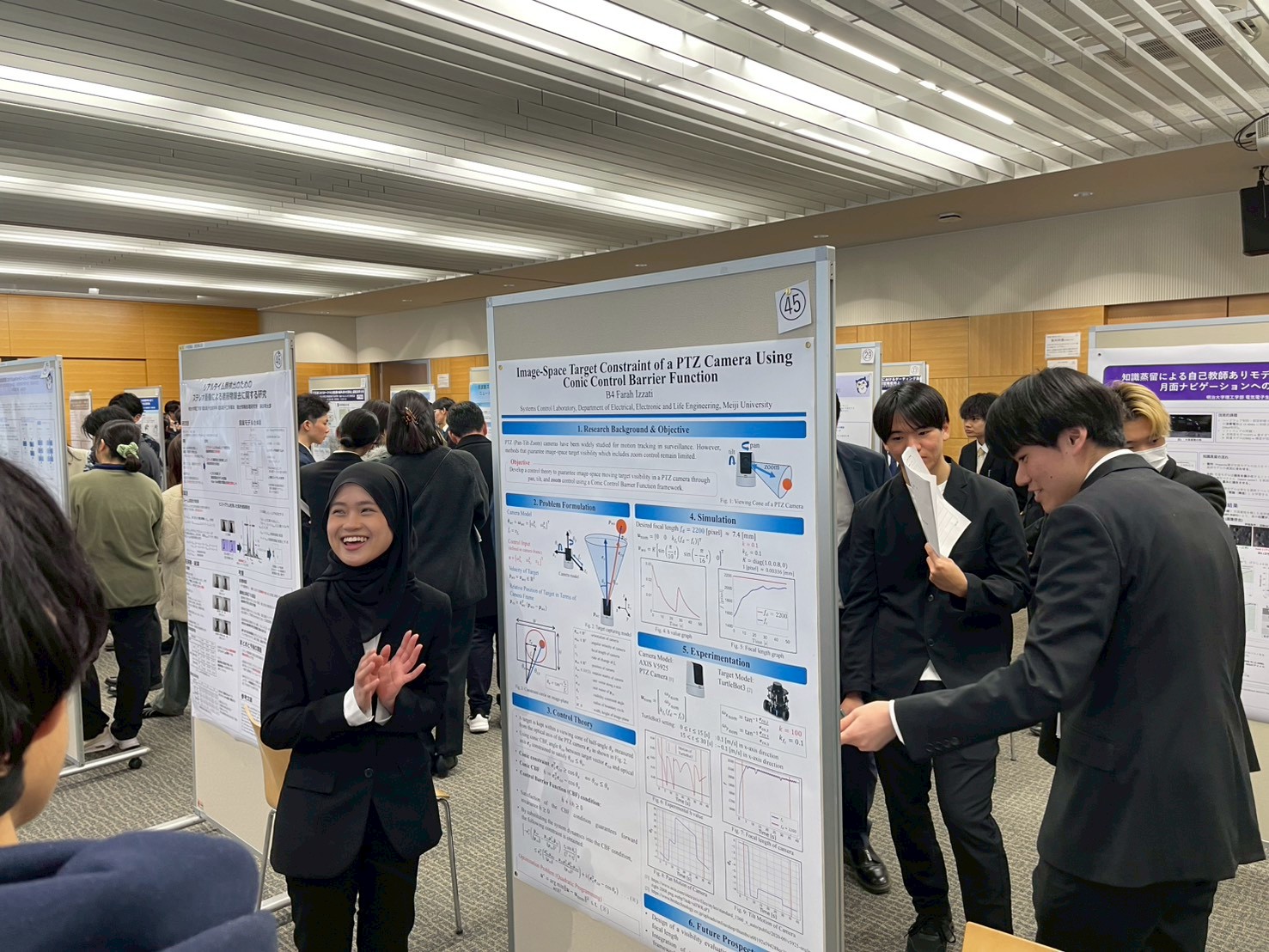 B4Izzatiが「Image-Space Target Containment Control of a PTZ Camera Using a Conic Control Barrier Function」をテーマとしてポスター発表している様子です.