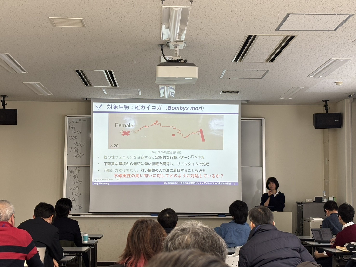 M2関和が「匂い源探索における昆虫の能動的センシングメカニズムの構成論的解析」のテーマの下,発表を行いました.いつも緊張してしまうので,「楽しく,元気よく」を心がけて発表しました.質疑応答には若干課題が残りましたが,今までの学会参加経験を活かした発表ができたと思います.本学会で口頭発表を行っていたので,翌日の修士論文発表では落ち着いて臨むことができました