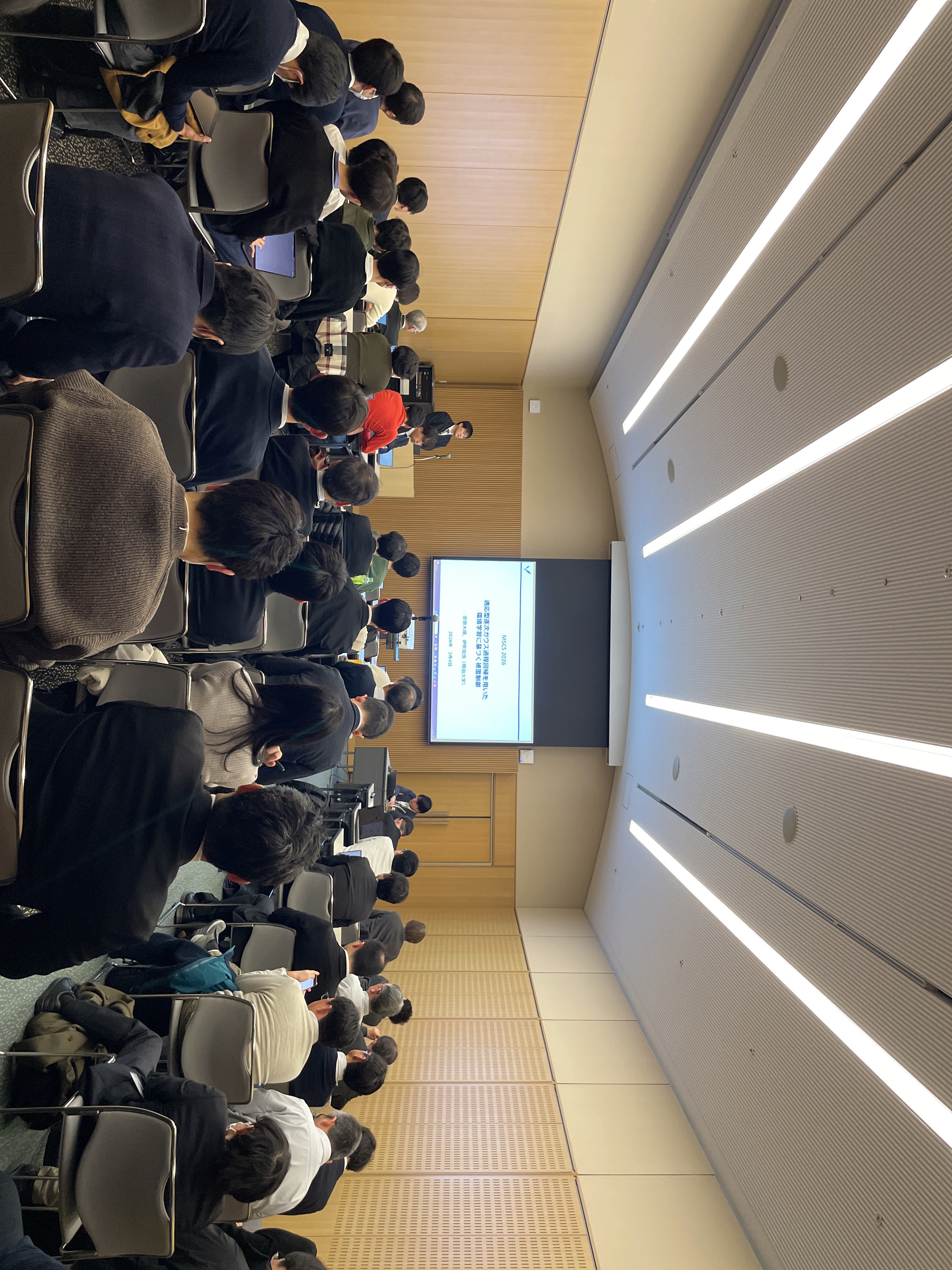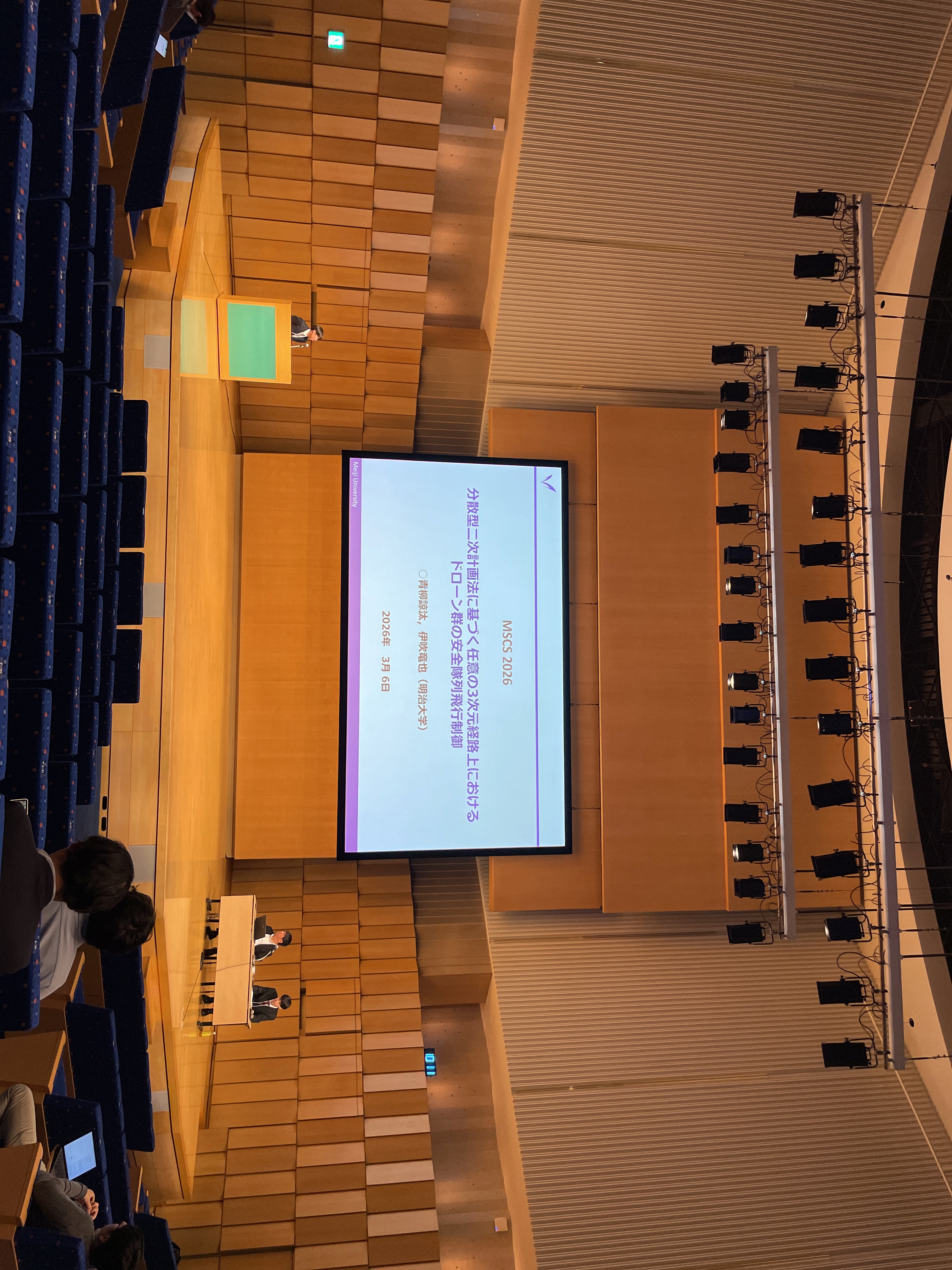 M2青柳が「分散型二次計画法に基づく任意の3次元経路上におけるドローン群の安全隊列飛行制御」のテーマの下,発表を行いました.今回は自身2回目の学会発表であり,直前に修士論文発表も経験していたため,落ち着いて臨むことができました.また,他の方々の発表からも多くの学びがあり,大変有意義な時間となりました.学生生活の集大成として,良い形で締めくくることができたと思います.