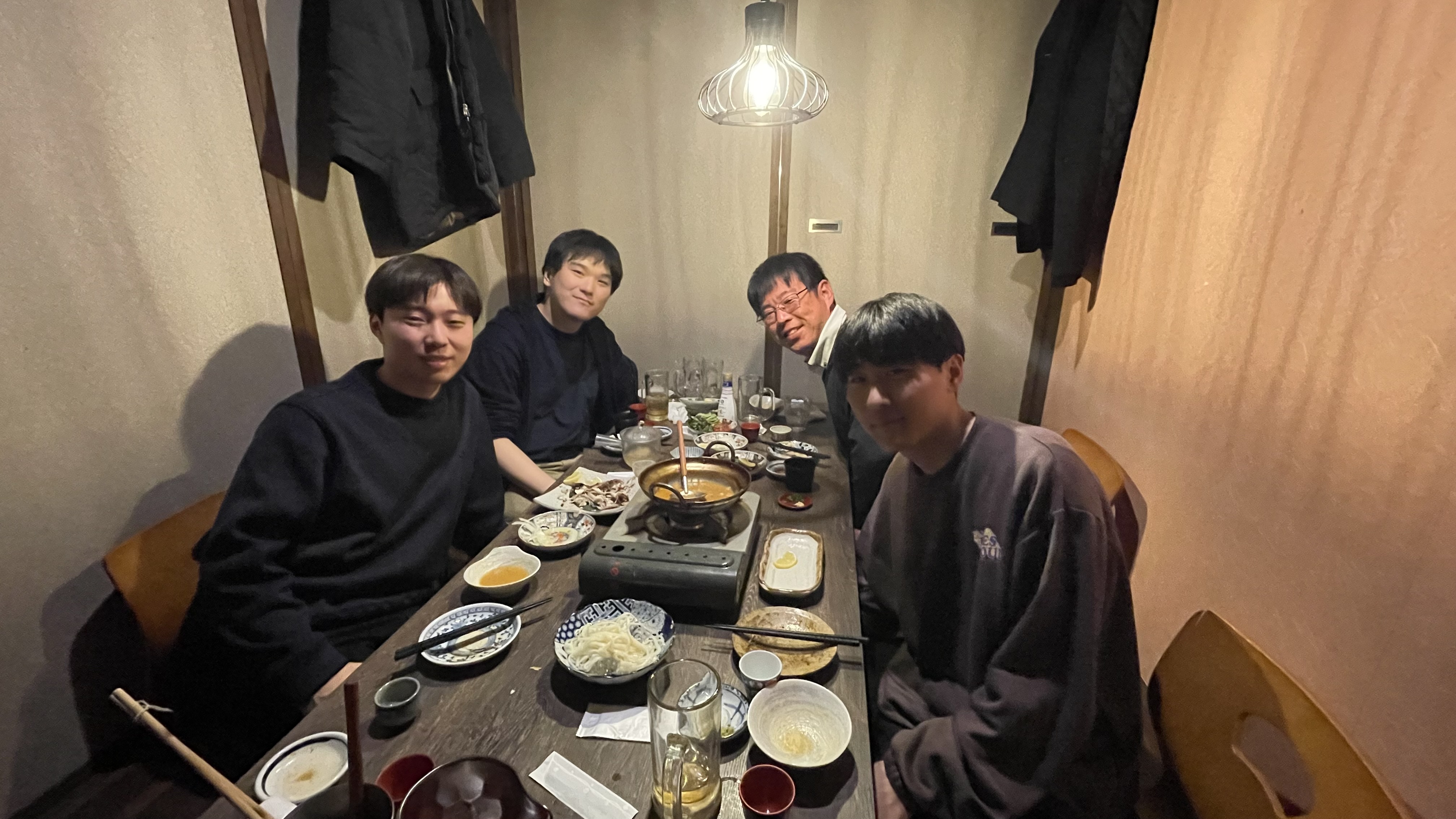 初日にみんなで海鮮居酒屋に行きました!ホタルイカや氷見うどんなどの富山名物を食べました!